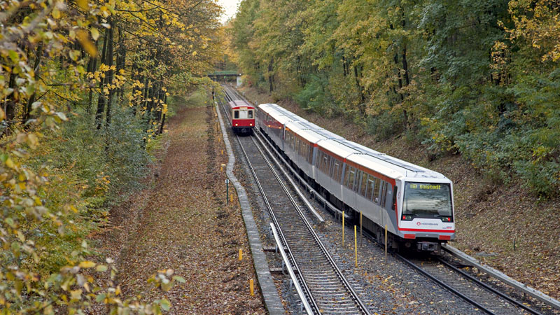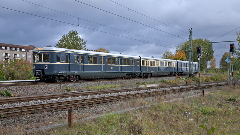 | Der ausfahrende DT4-Zug nach Ohlstedt begegnete dem DT1 "Der Hanseat"… Hamburg-Volksdorf | Buckhorn, 24. Oktober 2010 |