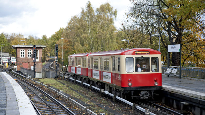 | Ein DT4-Achtwagenzug fährt ein – links war mal die Trasse der Kleinbahn Altrahlstedt - Wohltorf. Hamburg-Volksdorf | Buckhorn, 24. Oktober 2010 |