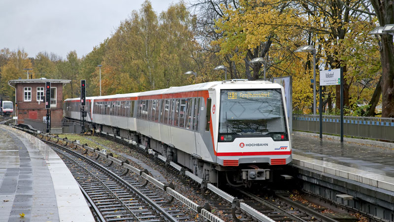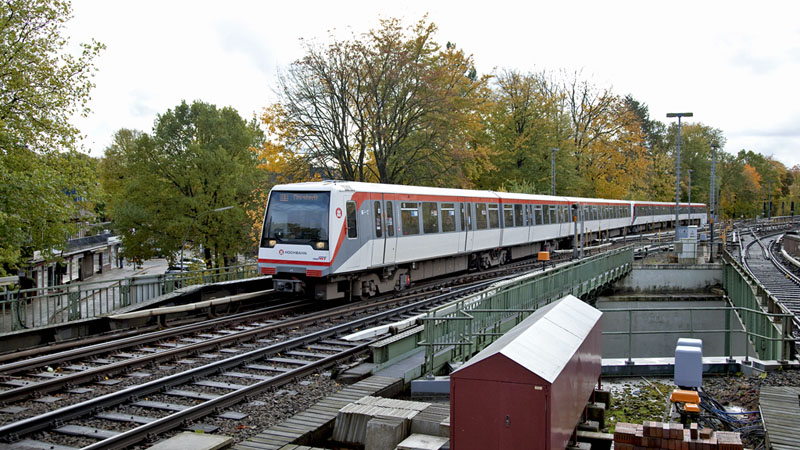| Ein einfahrender DT4-Zug aus 119 und 174 nach Großhansdorf. Hamburg-Volksdorf, 24. Oktober 2010 |