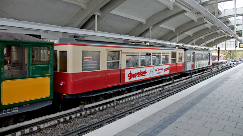 | Dazwischen der TU1-Wagen 8838 mit der Doornkaat-Werbung. Hamburg-Volksdorf, 24. Oktober 2010 |