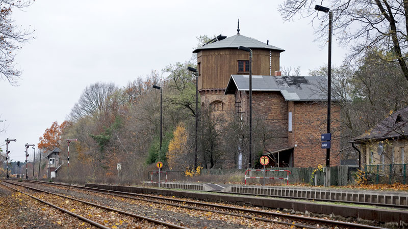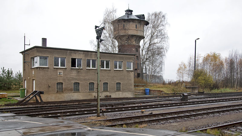 | Das Wärterstellwerk W1 und der langsam verfallende Wasserturm an der Osteinfahrt. Horka Güterbahnhof, 7. November 2010 |