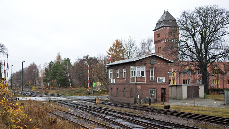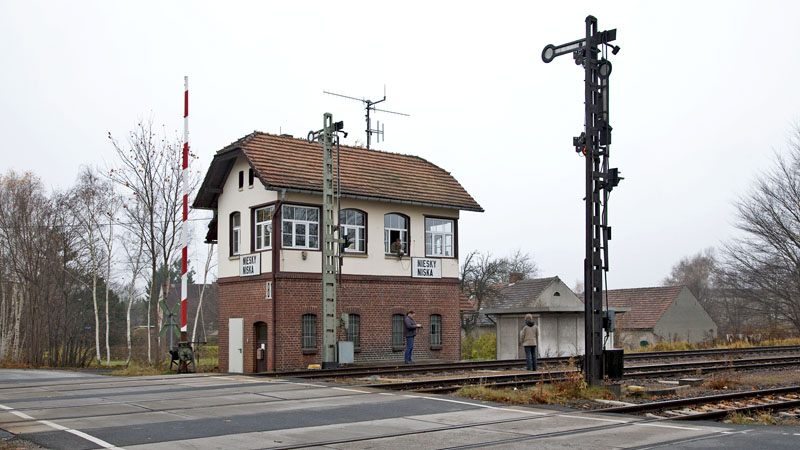 | Das Stellwerk W1 und im Hintergrund das Waggonbau Niesky. Niesky, 6. November 2010 |