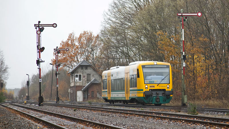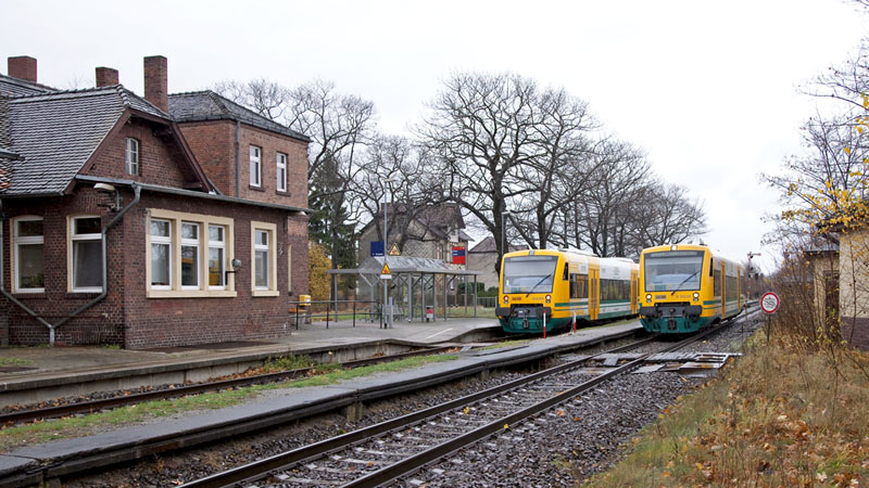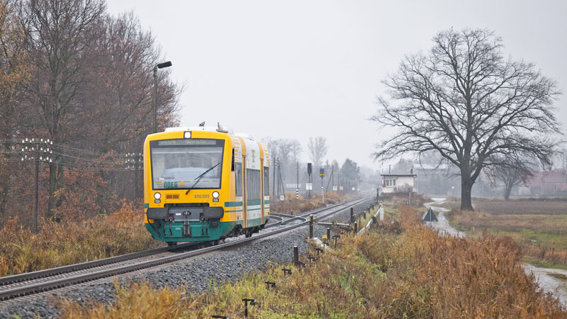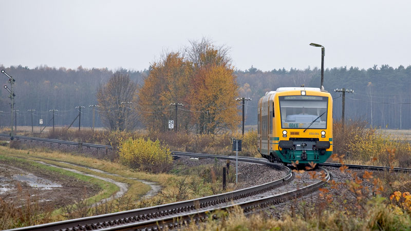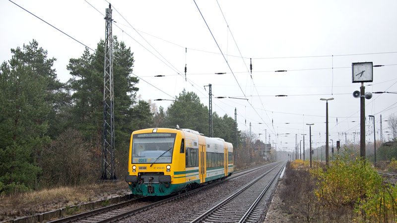 | Triebwagenkreuzung der ODEG-VT 650.085 und 650.69. Klitten, 6. November 2010 |