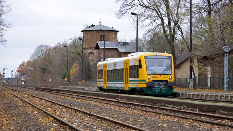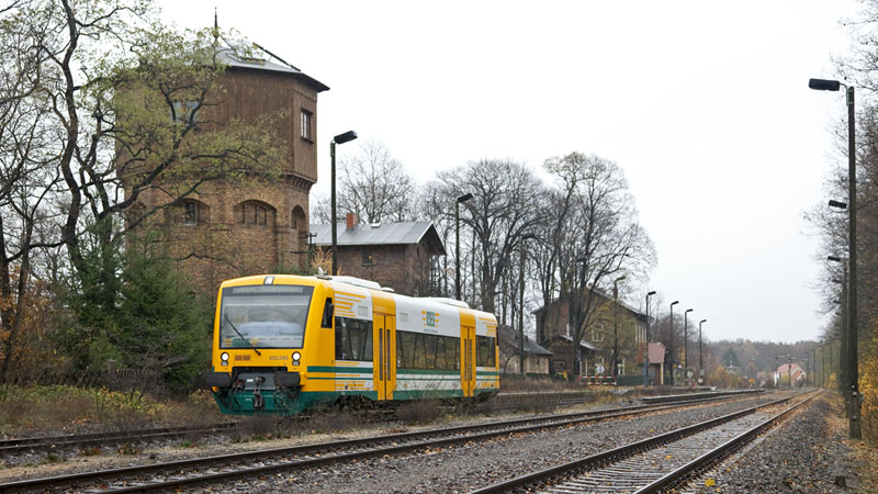 | Der Gegenzug mit dem VT 650.085 vor dem Wasserturm und Bahnhofsgebäude. Uhyst, 6. November 2010 |