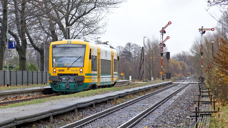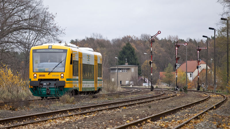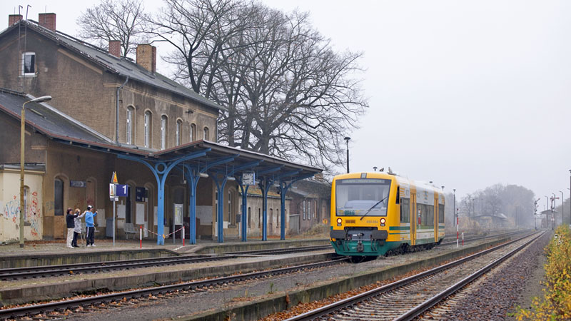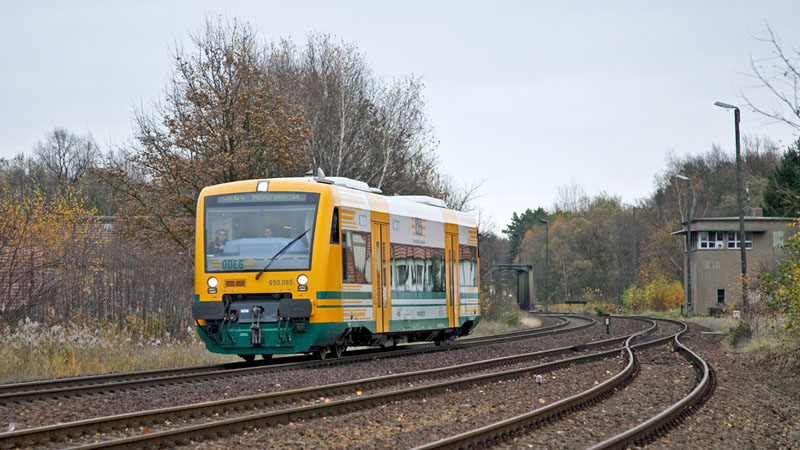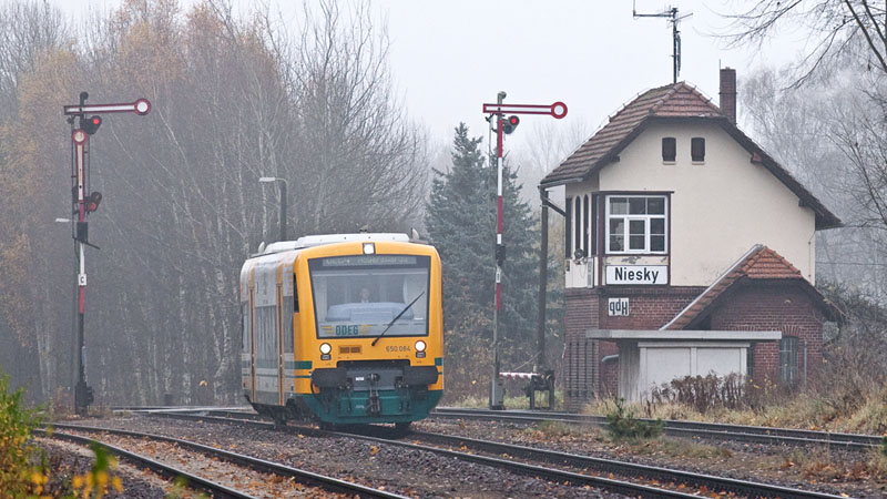 | Der zweistündliche Regionaltriebwagen der ODEG von Hoyerswerda nach Görlitz mit dem VT 650.085 fährt ein. Lohsa, 5. November 2010 |