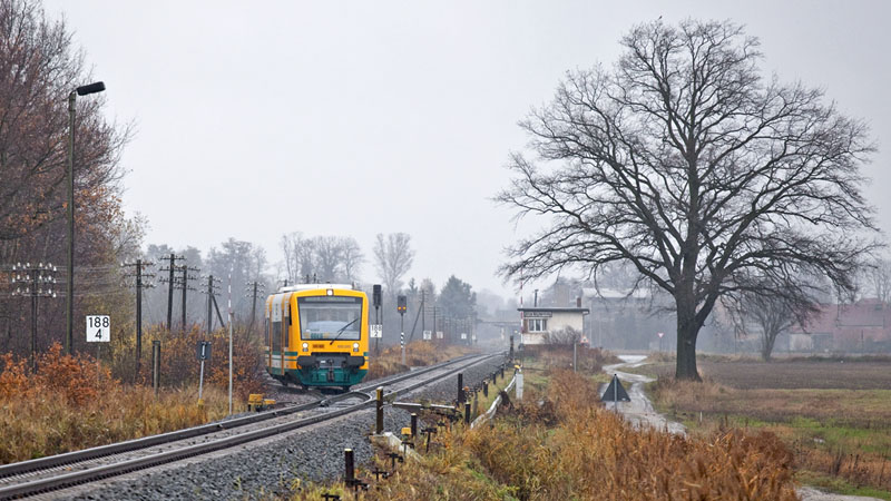 | Von Görlitz kam VT 650.085 über die Abzweigung von der Görlitz-Cottbuser Strecke. Abzweig Särichen, 7. November 2010 |