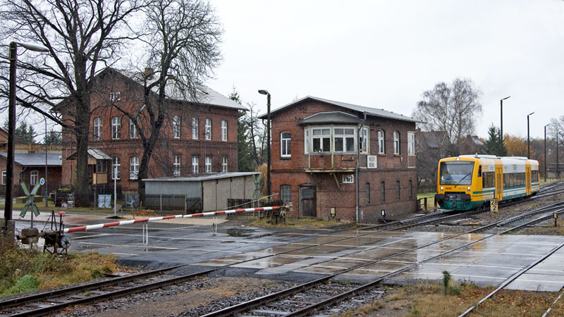 | Die ausfahrende Regionalbahn nach Hoyerswerda am Stellwerk W1. Niesky, 6. November 2010 |