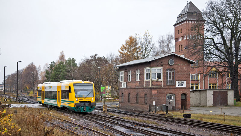 | Die einfahrende Regionalbahn nach Görlitz mit dem ODEG-VT 650.69. Niesky, 6. November 2010 |