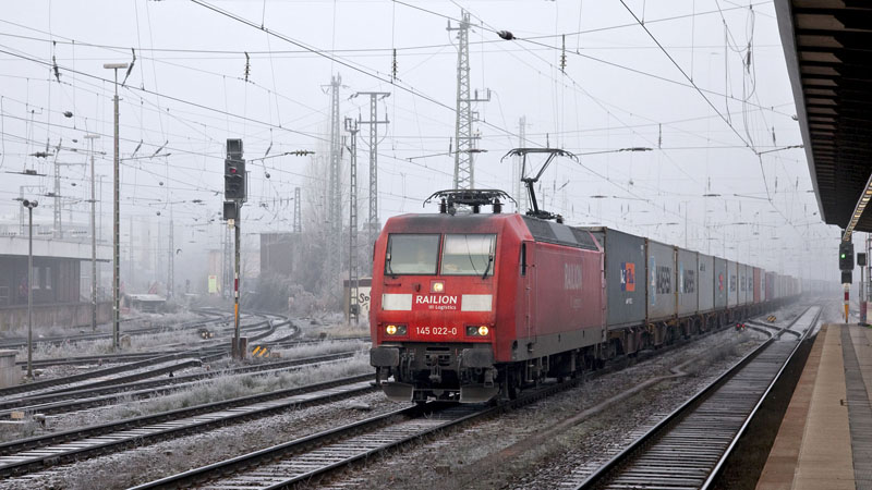 | Aus dem Nebel kam der Zug… die 145 022-0 mit Containern von Bremerhaven. Bremen Hauptbahnhof, 27. November 2010 |