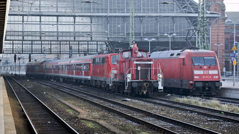 | Das rüstige "Dreibein" namens 363 185-0 randalierte mit der 111 087-3 und einem Zug. Bremen Hauptbahnhof, 27. November 2010 |