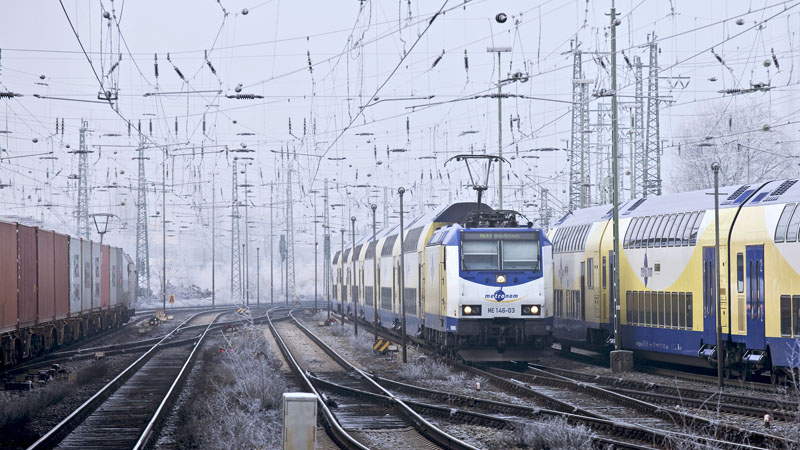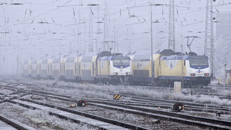 | Begegnung zweier metronom-Züge von und nach Hamburg mit ME 146-14 und ME 146-10. Bremen Hauptbahnhof, 27. November 2010 |