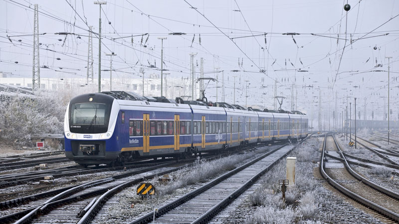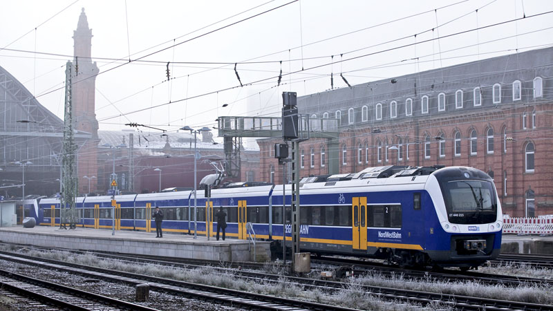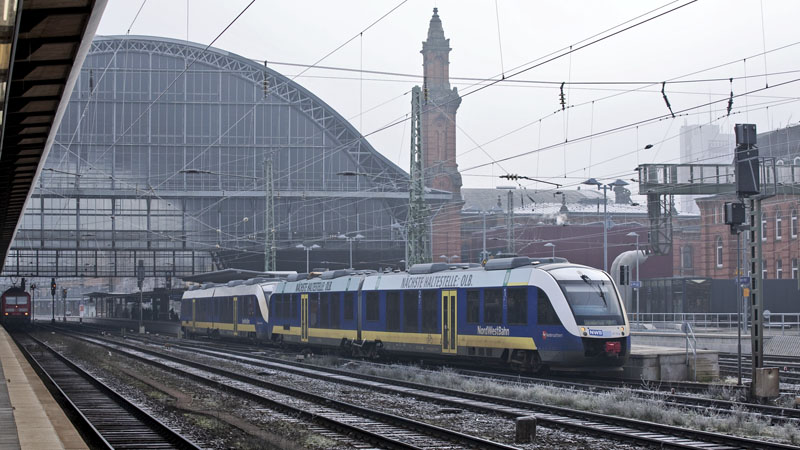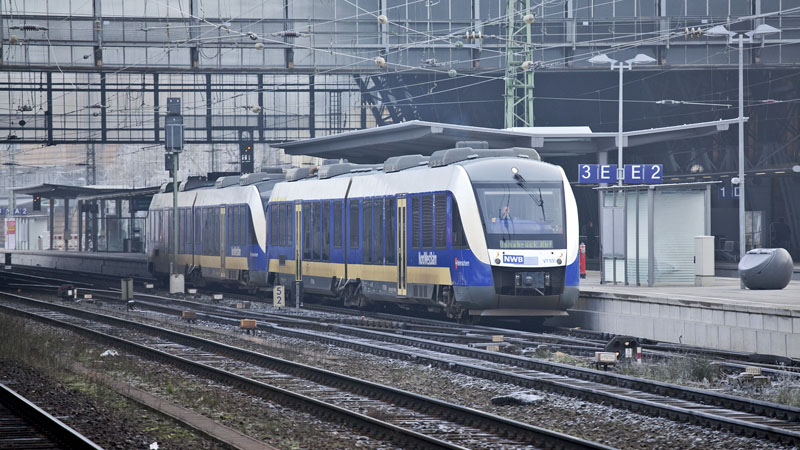| Eine einfahrende NWB mit dem führenden VT 503. Bremen Hauptbahnhof, 27. November 2010 |