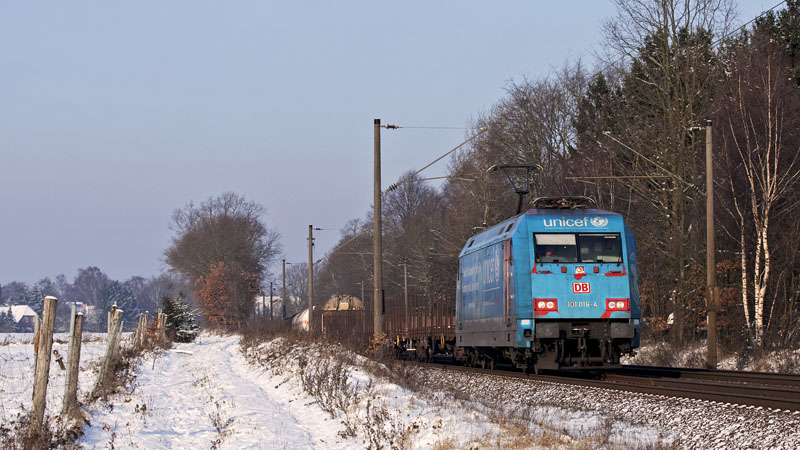 | Die reichlich zerfledderte "unicef" 101 016-4 mit Güterzug… Reindorf, 4. Dezember 2010 |