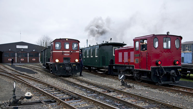 | Die beiden Dieselloks V3 und V4 EMDEN dieseln aneinander vorbei. Bruchhausen-Vilsen, 12. Dezember 2010 |