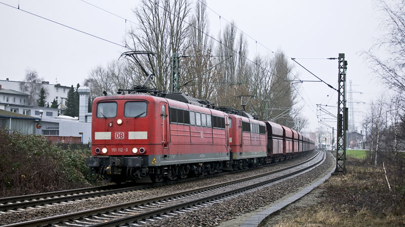 | Der schwere Erzbomber mit den AK-Loks 151 112-0 und 151 091-6 nach Sz-Beddingen. Hamburg-Unterelbe, 22. Januar 2011 |