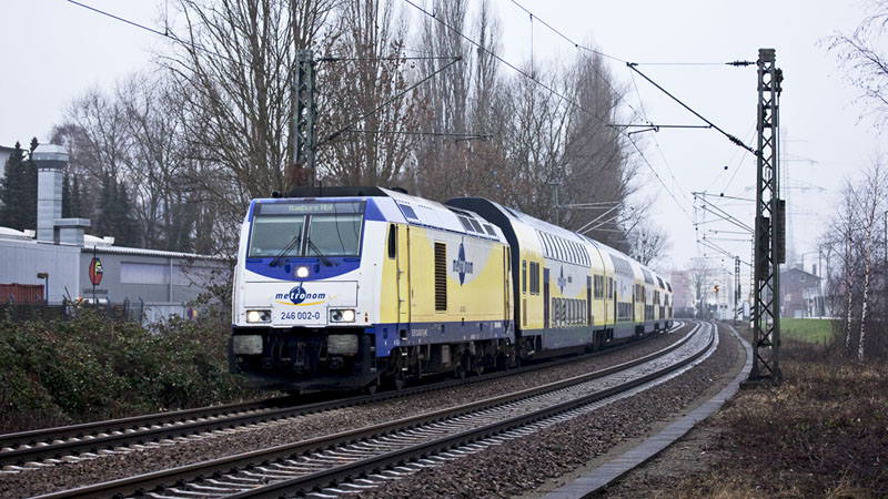 | Der metronom von Cuxhaven nach Hamburg mit der sauberen Diesellok 246 002-0. Hamburg-Unterelbe, 22. Januar 2011 |