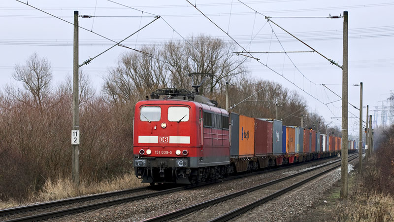 | Die ex-Bundesbahn-Lok 151 039-5 kam mit vielen Containern aus dem Hafen. Hamburg-Moorburg, 23. Januar 2011 |