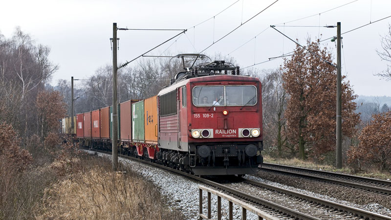 | Die ehemalige Reichsbahn-Lok 155 109-2 kam mit einem Containerzug herein. Hamburg-Moorburg, 23. Januar 2011 |