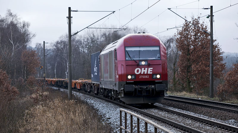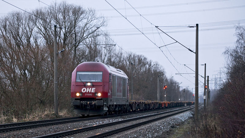 | Die OHE 270082 kam mit leeren Containerwagen aus dem Hafen. Hamburg-Moorburg, 23. Januar 2011 |