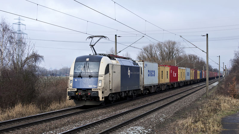 | Die 183 704 der Wiener Lokalbahnen Cargo hatte zig Container am Haken. Hamburg-Moorburg, 23. Januar 2011 |