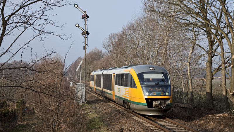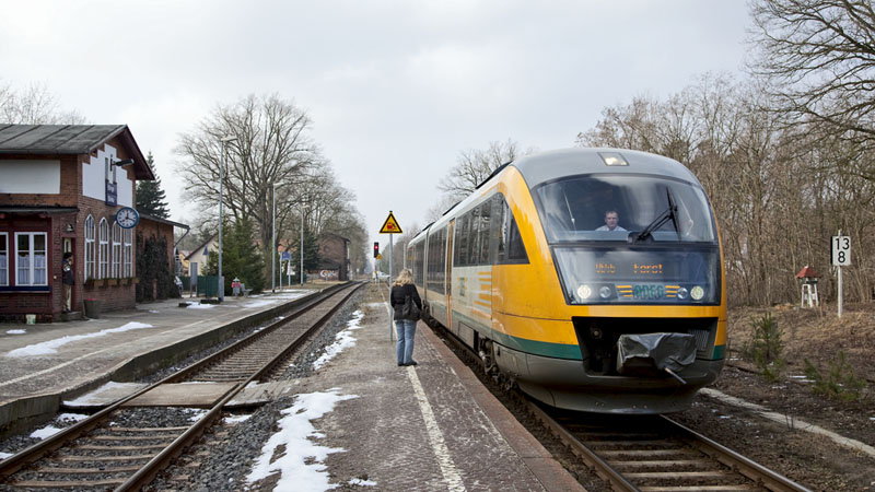 | Der Triebwagen der Ostdeutschen Eisenbahn beim Halt in diesem kleinen, aber noch besetzten Bahnhof. Klinge (Lausitz), 28. Januar 2011 |
