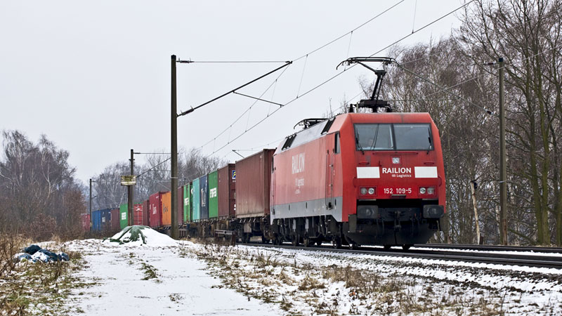 | Die 152 109-5 kam mit weiteren Containern in den Hafen herein. Hamburg-Moorburg, 15. Februar 2011 |