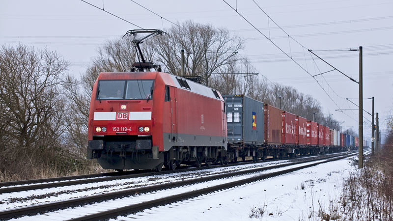 | Einen weiteren Containerzug brachte die 152 119-4 heraus. Hamburg-Moorburg, 15. Februar 2011 |