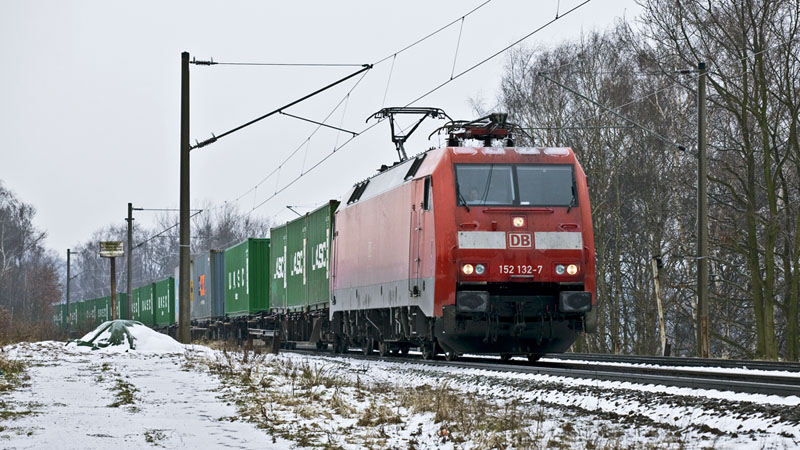 | Es rollte gut. Die versiffte 145 017-0 mit einem Containerzug. Hamburg-Moorburg, 15. Februar 2011 |
