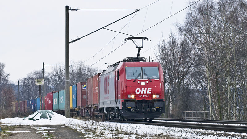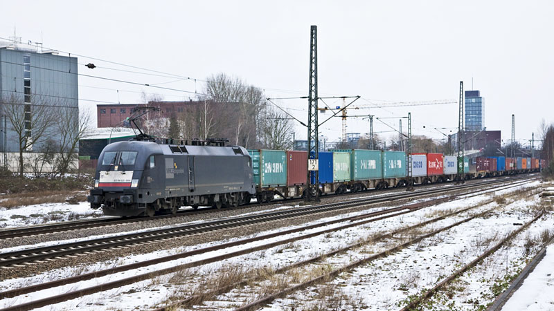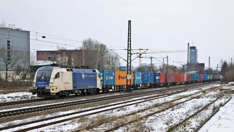 | Die ES 64 U2-024 der WLB mit Containerzug (diese Lok verunglückte eine Woche später in Österreich…). Hamburg-Unterelbe, 19. Februar 2011 |