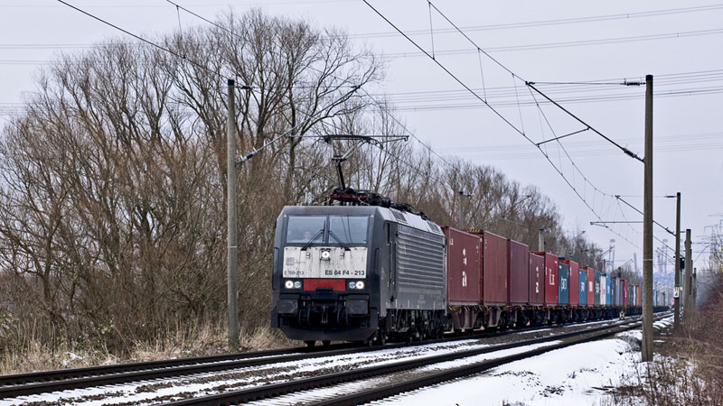 | Die schmutzig-schwarze ES 64 F4-213 kam mit einem Containerzug heraus. Hamburg-Moorburg, 19. Februar 2011 |