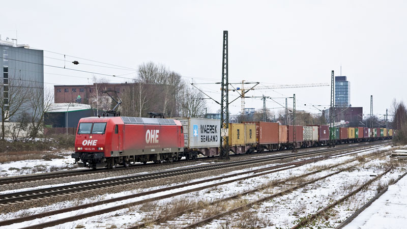 | Die 145-CL 015 der OHE mit einem weiteren Containerzug in den Hafen. Hamburg-Moorburg, 15. Februar 2011 |