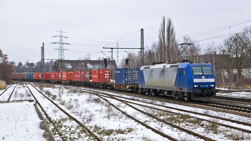 | Auch die 185-CL 008 ist zur Zeit für die VPS unterwegs, hier mit einem Containerzug aus dem Hafen. Hamburg-Unterelbe, 19. Februar 2011 |