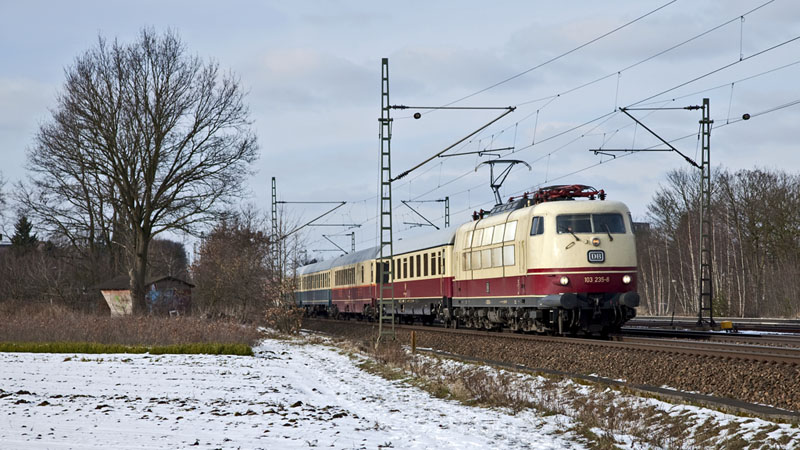 | Der berühmt-berüchtige IC 2417 von Flensburg nach Köln mit der schönen 103 235-8! Halstenbek, 20. Februar 2011 |