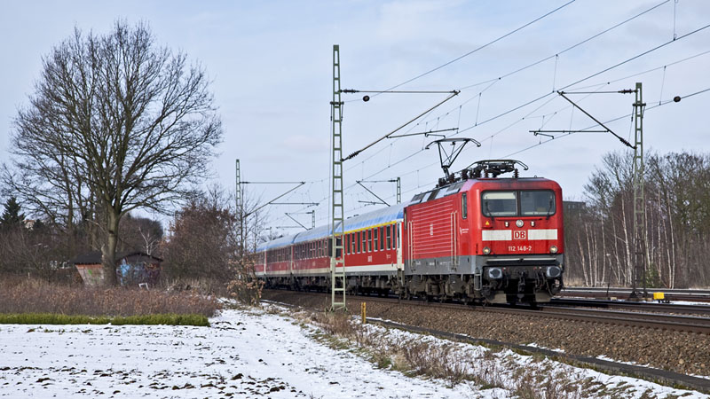 | Die 112 148-2 bretterte mit ihrem SH-Express von Flensburg nach Hamburg durch. Halstenbek, 20. Februar 2011 |