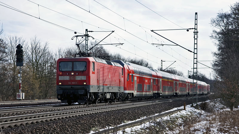 | Ausnahmsweise fuhr der RE nach Kiel mit zwei Loks, voran die 112 168-0 und hinten die 112 167-2. Halstenbek, 20. Februar 2011 |