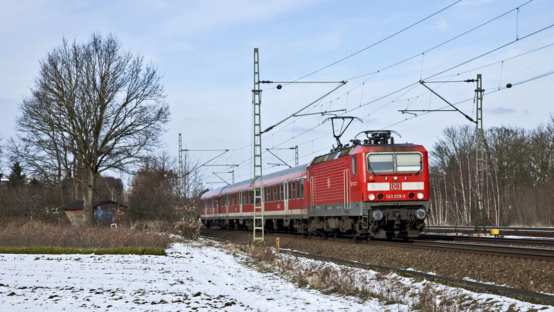 | Die unverwüstliche 143 229-3 mit ihrem 3-Wagenzug nach Hamburg. Halstenbek, 20. Februar 2011 |