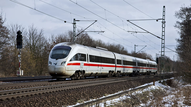 | Der Diesel-ICE 381 von Århus nach Berlin mit dem Triebzug 605 016. Halstenbek, 20. Februar 2011 |