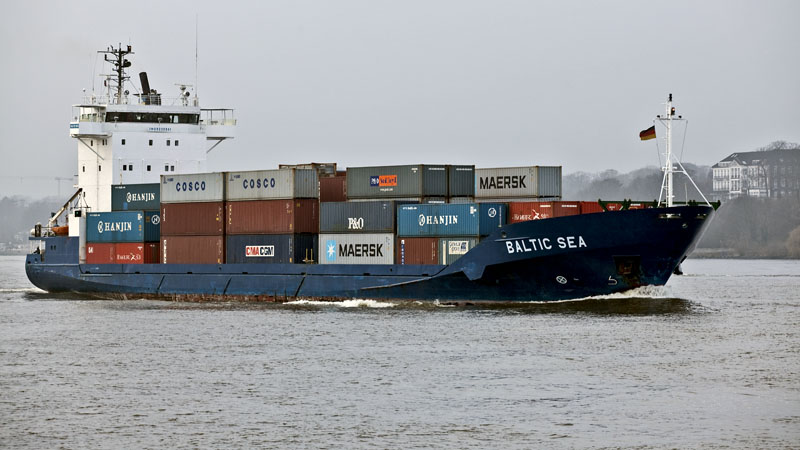 | Ein Küstenmotor-Containerschiff, die BALTIC SEA. Hamburg-Waltershof, 4. März 2011 |