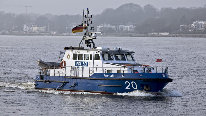 | Die Wasserschutzpolizei mit ihrem Patrouillenboot AMERIKAHÖFT. Hamburg-Waltershof, 4. März 2011 |