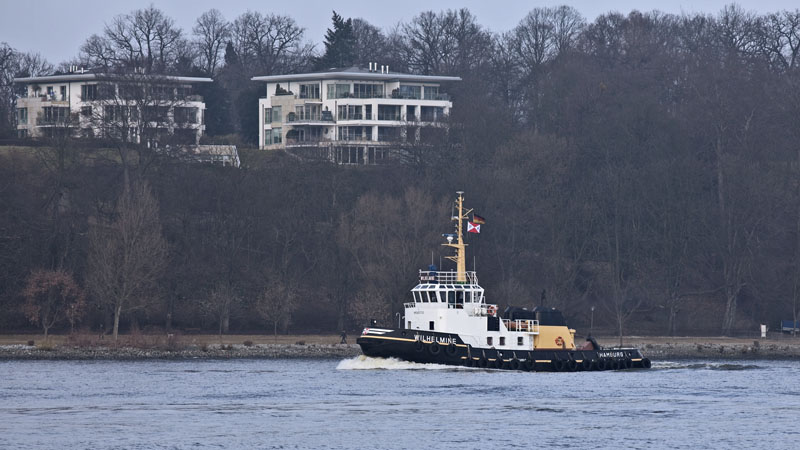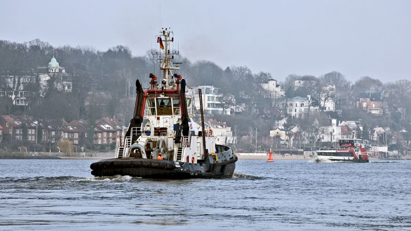 | Eins der großen Hafenschlepper, die HANS, vor der Kulisse von Övelgönne. Hamburg-Waltershof, 4. März 2011 |