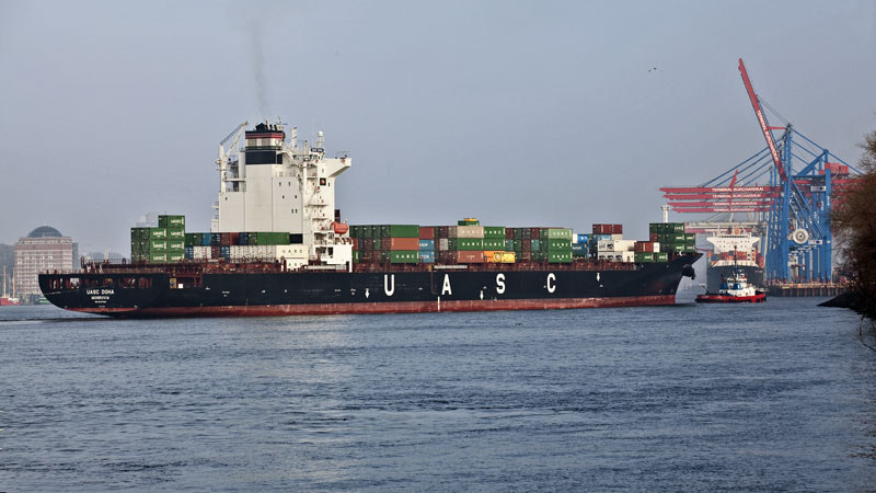 | Die UASC DOHA beim Einlaufen in den Waltershofener Containerhafen. Hamburg-Waltershof, 4. März 2011 |