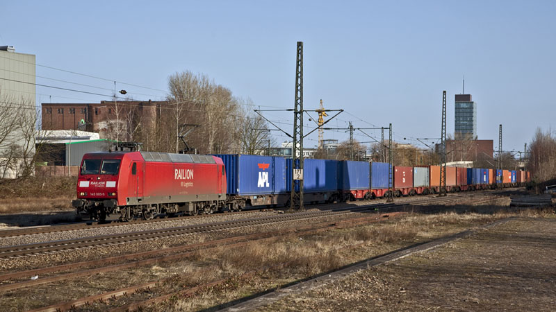 | Die arg ausgeblichene 145 012-1 mit ihrem Containerzug vom Hafen. Hamburg-Unterelbe, 5. März 2011 |
