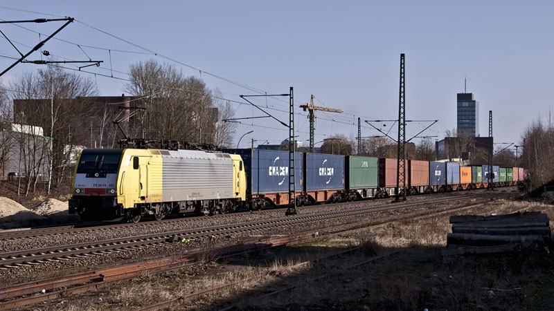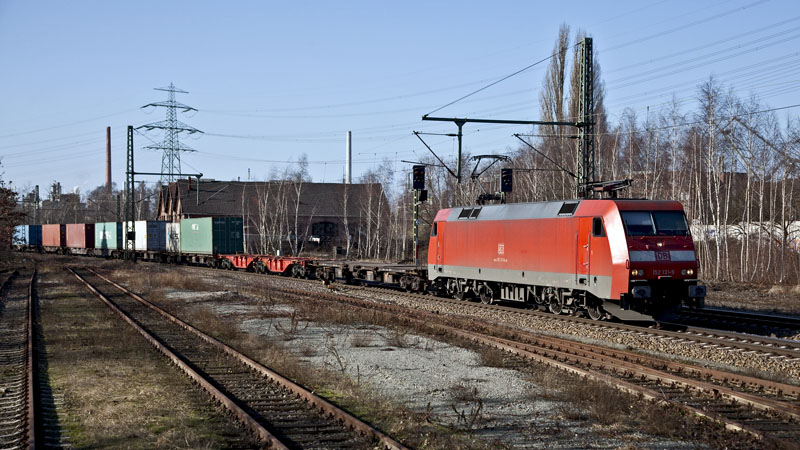 | Einen recht leeren Containerzug brachte die OHE 186 129-3. Hamburg-Unterelbe, 5. März 2011 |