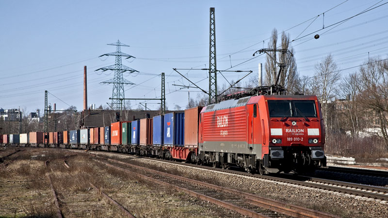 | Auf dem Weg in die Tschechei war dieser Containerzug mit der 189 010-2. Hamburg-Unterelbe, 5. März 2011 |