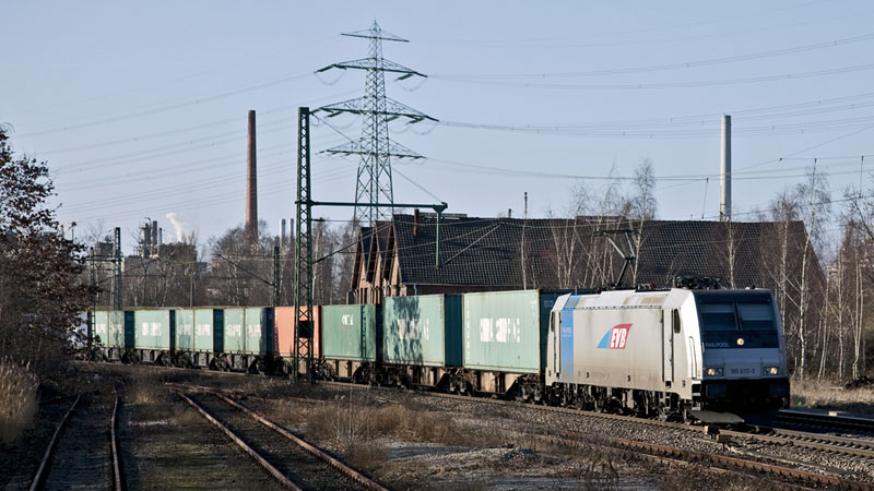 | Aus dem Hafen heraus kam die 185 672-3 der EVB. Hamburg-Unterelbe, 5. März 2011 |