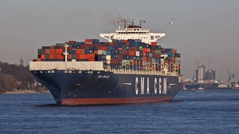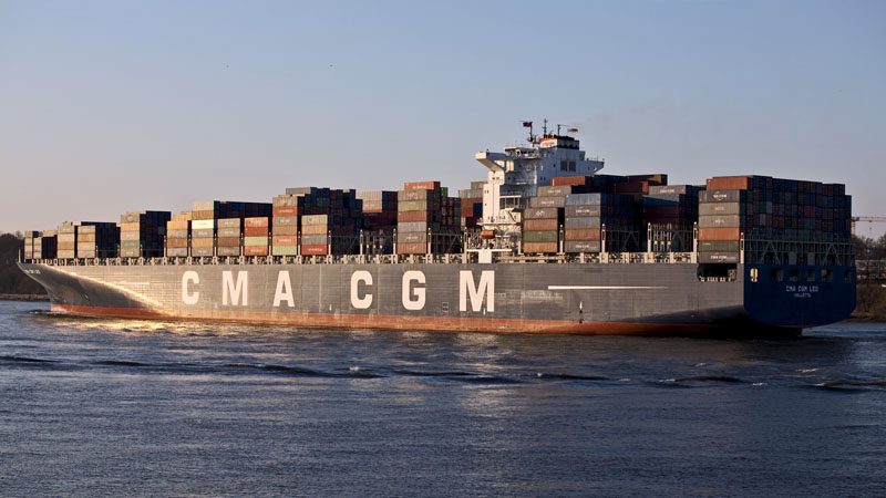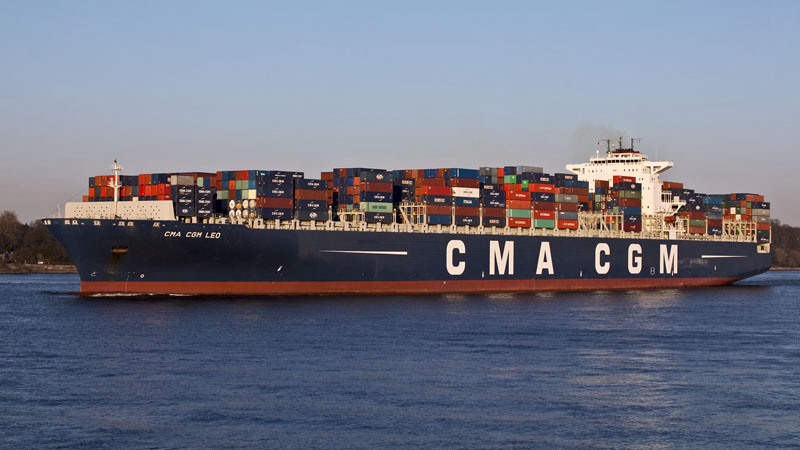 | CMA CGM LEO, ein Containerschiff mit 363 m Länge, 42 m Breite und 11.400 TEU. Hamburg-Finkenwerder, 8. März 2011 |