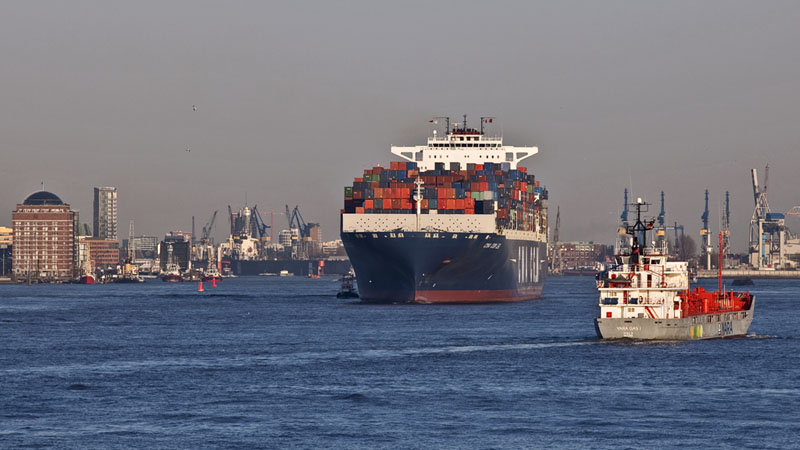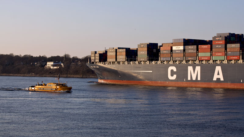| Die CMA CGM LEO auf dem Weg zur Mündung, der Deutschen Bucht. Hamburg-Finkenwerder, 8. März 2011 |