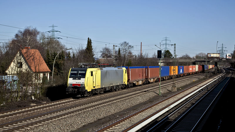 | Noch mehr Seekisten hatte die ES 64 F4-202 am Haken. Hamburg-Hausbruch, 8. März 2011 |