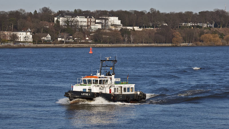 | Das bullige Lotsenversetzboot LOTSE 1 in voller Fahrt. Hamburg-Finkenwerder, 8. März 2011 |