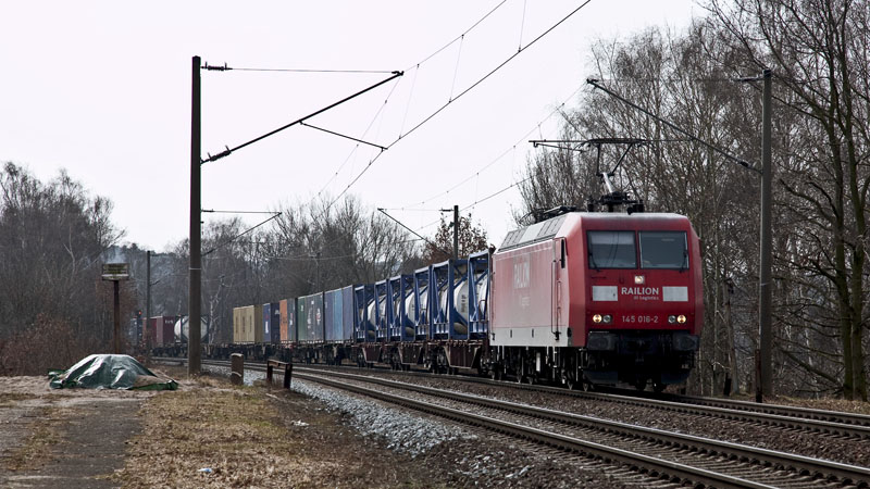 | Noch mehr Container brachte die 145 016-2 in Hafen. Hamburg-Moorburg, 12. März 2011 |